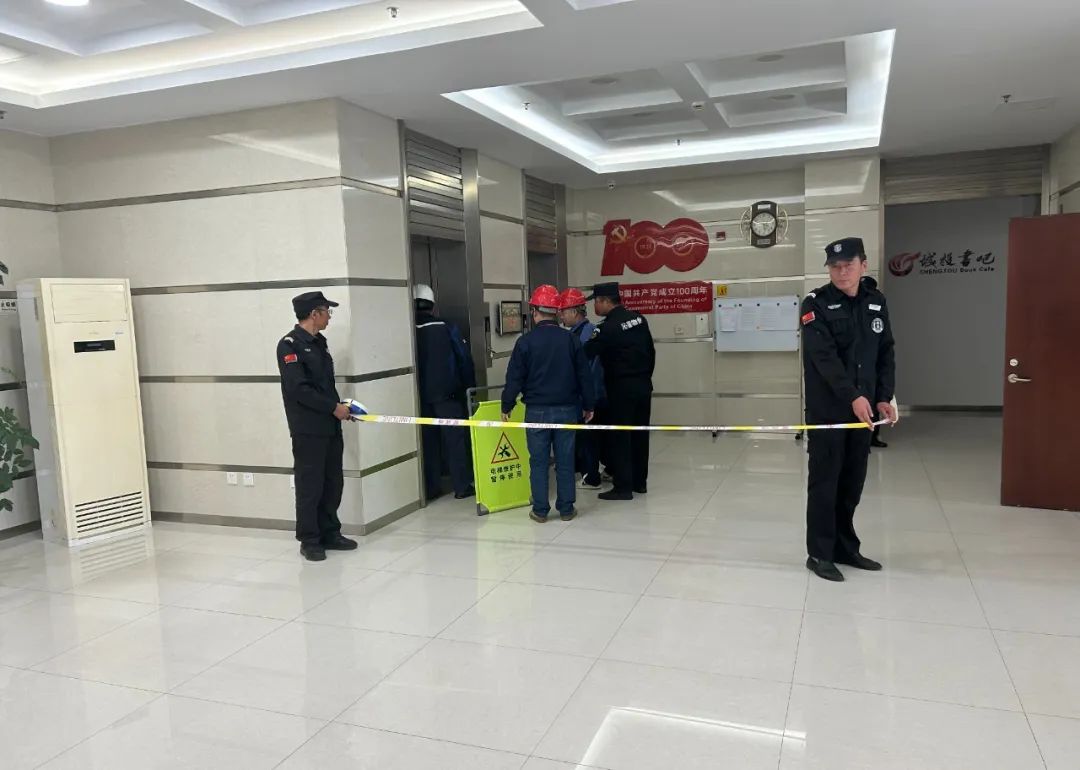 第三部分:电梯困人应急演练 由于触电事故的发生,大楼紧急断电导致电梯突发故障错位停靠,出现人员被困电梯轿厢内的险情。监控室值班人员接到报警后,及时安抚、告知被困人员安全注意事项,耐心等待维修人员救援。维保单位赶赴现场后,通过实操讲解电梯困人应急处置方法。