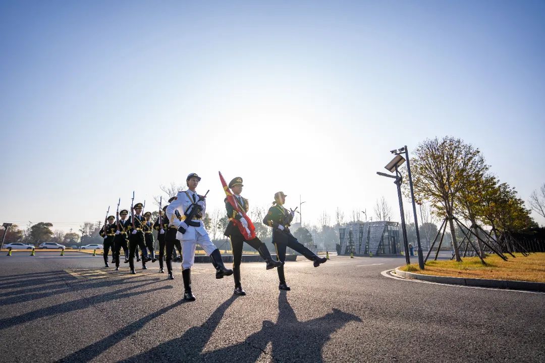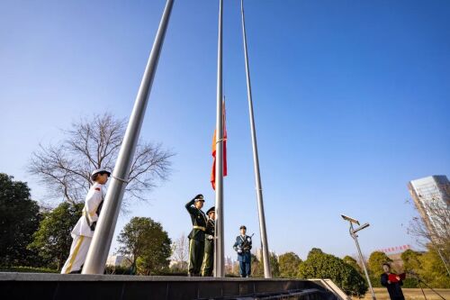 上午9时整,升旗仪式正式开始。仪仗队迈着铿锵有力的步伐,护送国旗至升旗台,护旗手衣着整齐、精神昂扬,站在旗杆两侧护卫着国旗。伴随着激昂嘹亮的国歌声,全体人员庄严肃立,向着国旗行注目礼,凝视五星红旗冉冉升起。