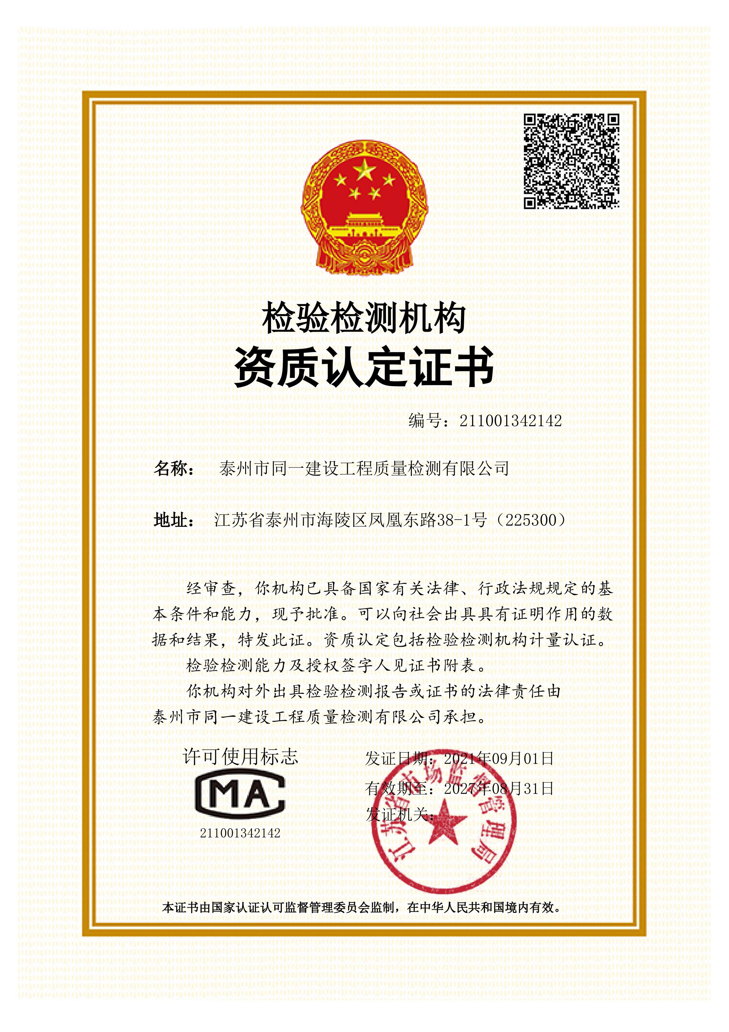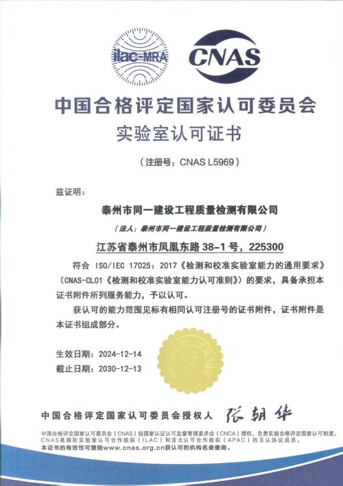 近日,泰州城投房建科技检测中心(同一检测公司)成功获评中国合格评定国家认可委员会(CNAS)颁发的照明检测领域扩项证书,这是自2024年10月获取江苏省市场监督管理局颁发的检验检测机构资质认定证书(CMA资质)后的又一重大突破,成为泰州市首家在照明检测领域具备CNAS、CMA双资质的检测机构。